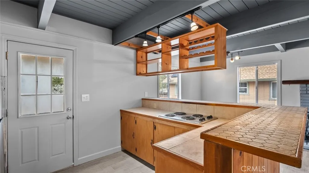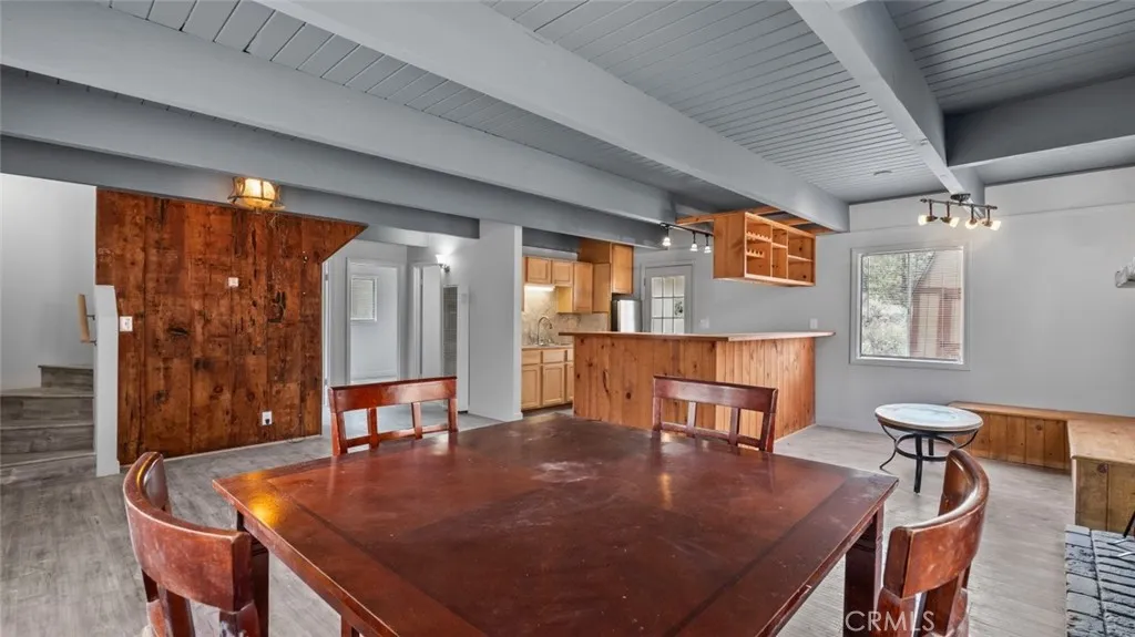 Upon entry, you’re welcomed into a charming living room adorned with a stunning stone fireplace, perfectly complementing the adjacent breakfast nook. The kitchen, adorned in light wood finishes, provides ample space for culinary creations, complete with a designated area for wine and other kitchen essentials.
