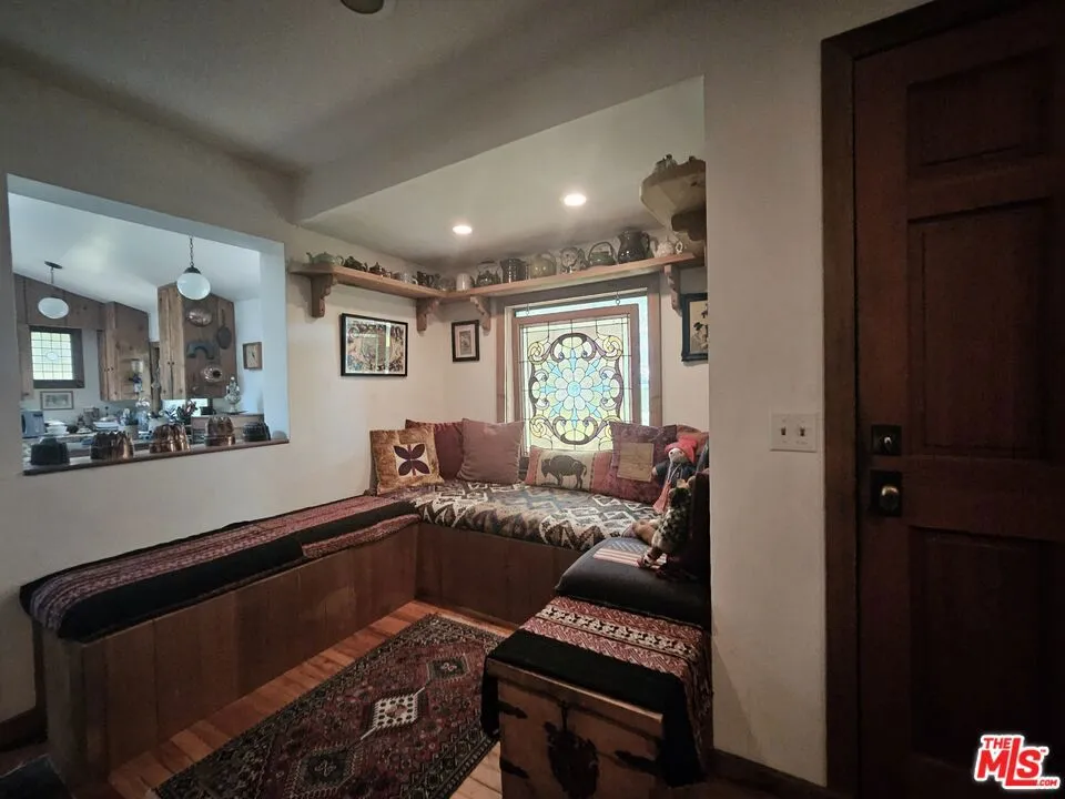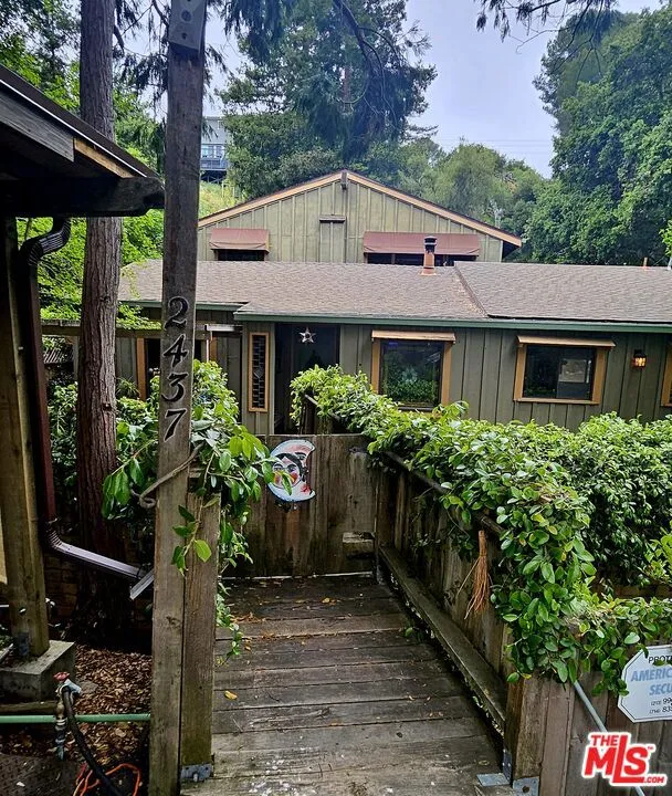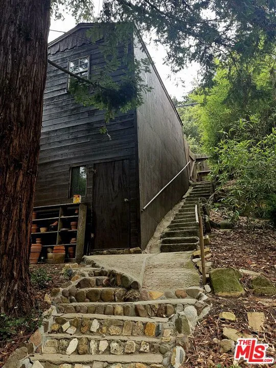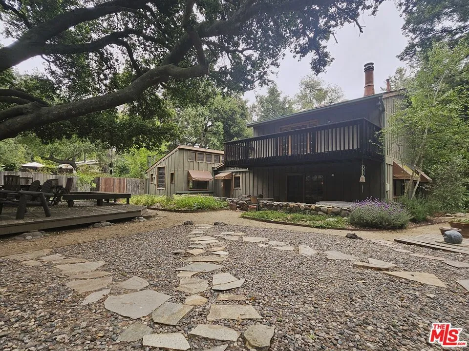 This vintage Topanga creekside family home with mutiple outbuildings is on the market for the first time in 42 years! Step back in time as you cross over the creek on your private footbridge into this fabulous Liberty Lane sanctuary. You’ll enter through a beautiful stained glass covered porch into a warm and inviting space with Vermont Castings wood burning stove and built-in sitting area. This brings you to the the true heart of the home, a kitchen with a soaring ceiling and rough hewn red cedar cabinetry with magnificent multi pane and leaded glass windows. Also on this level is a proper dining room, den, 1st floor bedroom and living room with river rock fireplace– all over-looking a mostly flat yard, graced by a sacred Grandmother Oak with wrap around entertaining deck, Redwoods and multiple fruits trees. The 3 outbuildings provide plenty of storage and options for re-imagining to support all of your creative endeavors. Multiple patios, decks and outdoor living spaces, all within earshot of the seasonal creek, make this entertainer’s dream property the ideal backdrop for all of your Topanga Stories…